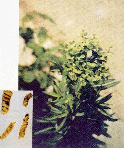 植物形态 多年生肉质草本,全草含乳汁。根细长,部分呈连珠状。茎直立,淡紫红色。单叶互生,狭披针形或线状披针形,全缘,无柄或具短柄。杯状聚伞花序,通常5~9枝簇生于茎端,基部轮生叶状苞片多枚;苞叶对生;萼状总苞先端4裂,腺体4枚;花单性,无花被;雄花多数和雌花一枚生于同一总苞中;雄蕊、雌蕊各一枚;雌花位于花序中央,子房三角卵形,3室,花柱3,柱头2裂。葫果圆形。花期6~9月。