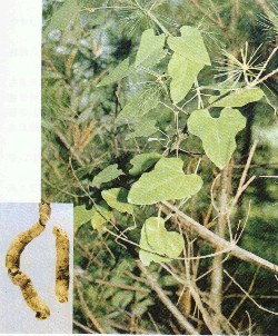 植物形态 缠绕藤本。茎幼时密被棕褐色绒毛。叶互生,心形或卵状心形,先端钝或短尖,上面绿色,下面灰绿色,均被白色柔毛;叶柄细长。花单生于叶腋,花梗密被灰棕色柔毛,中部有一心形苞片;花被黄色,外被长硬毛,中部收缩而弯曲,先端3裂,灰紫色;雄蕊6,贴生于花柱体周围;子房下位。蒴果长圆柱形。花期5~6月,果期7~8月。