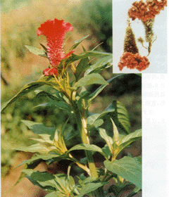 | | 中文名: | 鸡冠花 | | 类 别: | 花类 | | 英文名: | Cockscomb Flower | | 别 名: | 鸡髻花、老来红。 | | 来 源: | 为苋科植物鸡冠花Celosia cristata L. 的花序。 | | 采 制: | 秋季花盛开时采收,晒干。 | | 性 味: | 穗状花序多呈鸡冠状,扁平而肥厚,长8~25cm,宽5~20cm;上缘宽,具皱褶,密生线状鳞片,下端渐窄,常残留扁平的茎。表面红色、紫红色或黄白色;中部以下密生多多数小花,每花宿存的苞片及花被片均呈膜质。果实盖裂,种子圆肾形,黑色,有光泽。体轻,质柔韧。味淡。性凉,味甘、涩。 | | | 植物形态: | 一年生草本,高60~90cm,全株无毛。茎直立,粗壮,绿色或带红色。叶互生,卵形、卵状披针形,长5~13cm,宽2~6cm,两端渐尖。花序扁平,鸡冠状,顶生;苞片、小苞片和花被片紫色、红色、淡红色或黄色,干膜质;雄蕊5,花丝下部合生成杯状;子房上位,柱头2浅裂。胞果卵形,盖裂。种子扁圆形或略呈肾形,黑色,有光泽。花期7~10月,果期9~11月。 | | 生长地: | 全国各地均有栽培。 | | 化学成份: | 含 山柰甙(kaempoferitrin)、苋菜红甙(amaranthin)、松醇(pinitol )及多量硝酸钾。红色花含苋菜红素,黄色花含量微。 | | 功能主治: | 收涩止血,止带,止痢。用于吐血、崩漏、便血、痔血 、赤白带下、久痢不止。 | | 附注: | | | |