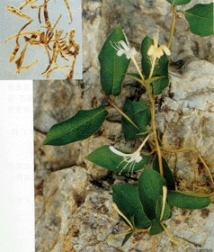 | 植物形态: | 缠绕半灌木,常绿。幼枝密被柔毛和腺毛,老枝棕褐色,呈条状剥离,中空。叶对生,卵形至长卵形,长3~8cm,宽1.5~4cm,初时两面有毛,后则上面无毛。花成对腋生,花梗及花均有短柔毛;花冠初开时白色,后变黄色,外被柔行和腺毛,花冠筒细长;雄蕊5,伸出花冠外;子房下位。浆果球形,熟时黑色。花期4~6月,果期7~10月。 |