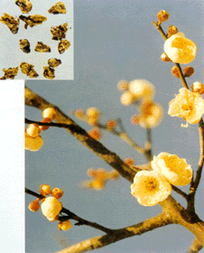 | | 中文名: | 梅花 | | 类 别: | 花类 | | 英文名: | Plum Blossom | | 别 名: | 酸梅、黄仔、合汉梅。 | | 来 源: | 为蔷薇科植物梅Prunus mume(Sieb.)Sieb.et Zucc.的花蕾。 | | 采 制: | 初春花未开放时采摘,及时低温干燥。 | | 性 味: | 花蕾尖球形,直径3~6mm,有短梗。苞片数层,鳞片状,棕褐色;花萼灰绿色或红棕色;花瓣5或多数,黄白色或淡粉红色。体轻。气清香,味微苦、涩。性平,味微酸、涩。 | | | 植物形态: | 落叶乔木,小枝多绿色,枝端尖刺状,无毛,叶互生,宽卵形至卵形,长4~10cm,宽3~5.5cm,先端长渐尖,基部宽楔形或近圆形,边缘有细锯齿,下面色较浅,嫩时两面有毛,老时仅下面脉上有柔毛;叶柄有毛,托叶早落。花1~2朵簇生,先叶开放,有香气,萼片5,常带紫红色,花后常不反折;花瓣5,白色、红色或淡红色,有的重瓣;雄蕊多数,心皮1,密被短柔毛。核果近球形,两边扁,有纵沟,直径2~3cm,熟时黄色,有短柔毛。花期3月,果期5~6月。 | | 生长地: | 全国有栽培。 | | 化学成份: | 含苯甲酸、苯甲醛、异丁香酚(isoeugenol)等。 | | 功能主治: | 开郁和中,化痰,解毒。用于郁闷心烦、肝胃气痛、梅核气、瘰疬疮毒。 | | 附注: | 近成熟的果实亦入药,称:“乌梅”,能敛肺生津。 | | |