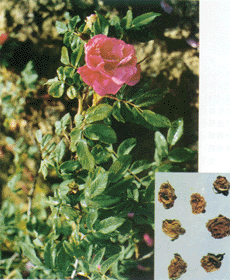 | 植物形态: | 落叶灌木,高约2m。茎枝有皮刺、腺毛,并密被绒毛。羽状复叶互生;小叶5~9,椭圆形或椭圆状倒卵形,长2~5cm,边缘有细锯齿,下面密被灰白色柔毛及腺体;叶柄、叶轴有绒毛、刺毛和皮刺;托叶大部附着于叶柄,边缘有腺点;叶柄基部的刺常成对着生。花单生或数朵聚生,有浓香气; 萼片5,披针形;花瓣5或重瓣,紫红色至白色;雄蕊多数,着生于花托边缘的花盘上;雌蕊多数,包于花托内。蔷薇果扁球形,砖红色,直径2~2.5cm,花期5~8月,果期6~9月。 |