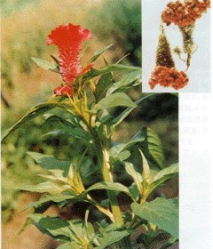植物形态 一年生草本,高60~90cm,全株无毛。茎直立,粗壮,绿色或带红色。叶互生,卵形、卵状披针形,长5~13cm,宽2~6cm,两端渐尖。花序扁平,鸡冠状,顶生;苞片、小苞片和花被片紫色、红色、淡红色或黄色,干膜质;雄蕊5,花丝下部合生成杯状;子房上位,柱头2浅裂。胞果卵形,盖裂。种子扁圆形或略呈肾形,黑色,有光泽。花期7~10月,果期9~11月。