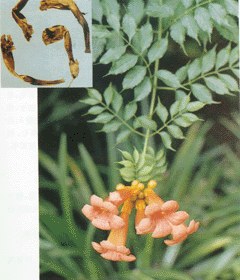 植物形态 多年生木质藤本。羽状复叶对生;小叶7~11,卵形至卵状披针形,先端长尖,基部不对称,边缘有锯齿,下面脉间有细柔毛。由三出聚伞花序集成顶生圆锥花丛;花萼钟形,肉质,5裂占上部1/3,萼齿三角形;花冠鲜红色,漏斗状,直径约4cm,先端5裂,雄蕊4,二强;子房2室。蒴果长如豆荚。种子多数。花期7~10月,果期11月。