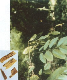 植物形态 乔木。幼嫩部分、花序及子房略被短柔毛;树皮褐色,粗糙;小枝近平滑,具密集的苍白色皮孔。羽状复叶互生;小叶9~13,近革质,卵形或椭圆形,基部小叶较小,阔卵形,侧脉和网脉于两面略凸起。圆锥花序腋生;萼钟状,5裂,上部2裂齿短阔;花冠蝶形,淡黄色或乳白色,各瓣近等长,均具爪;雄蕊9枚,1组;子房狭椭圆形,具长约2.5mm的柄。荚果舌状长椭圆形,长4.5~8cm,宽1.5~1.8cm,柄长5~10mm。种子常1枚,稀2枚。花期4~6月。