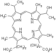 【分子式成分】化学名:1,3,5,8-四甲基-2,4-二(α-羟乙基)卟酚-6,7-二丙酸。分子式:C34H38N4O6。分子量:598.70。