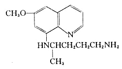 【药理】本品与扑疟喹同属8-氨基喹啉类衍生物,对红外期与配子体有较强的杀灭作用,为阻止复发、中断传播的有效药物。本品抗疟作用原理可能是其代谢产物具有氧化性质,干扰疟原虫红外期三磷酸吡院核苷酸的还原过程,影响疟原虫的能量代谢和呼吸而导致死亡。