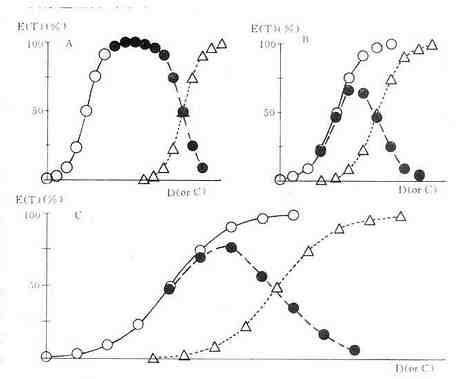○有效量的量效关系 △中毒量的量效关系