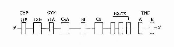 3.HLA-Ⅲ类基因 HLA-Ⅲ类基因区域至少已发现36个基因座,其中C2、C4、Bf座编码相应的补体成分,另外还有21羧化酶基因(CYP21A、B)肿瘤坏死因子基因(TNFA、B)以及热休克蛋白70(heat shock protein70,HSP70)基因。补体C4由二个不同的基因(C4A与C4B)编码。HLA-Ⅲ类基因区结构见图5-3。