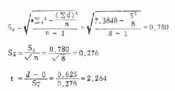 (3)求样本统计量平均相差数d、差数的标准差Sd、标准误Sd及检验统计量t值。
