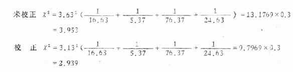 3.求χ2值 将表3.11的数值代入式(3.10)(因为在表3.11中,各组的a值较小,计算较方便)得: