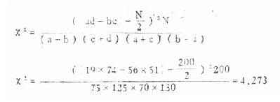 当用公式(3.5)求出的χ2值略大于3.84时,校正最为必要,往往会改变原来的结论,举例如下。