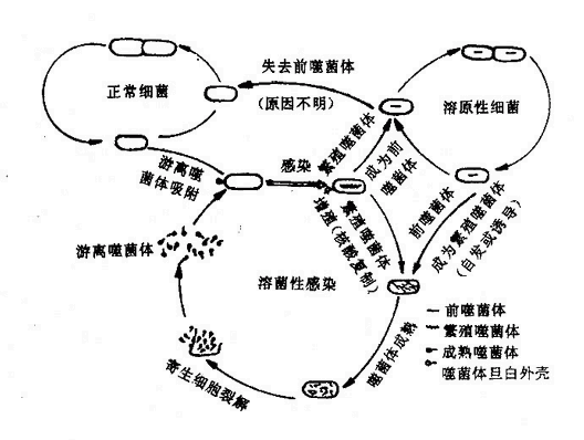溶源性噬菌体能正常繁殖,但这种带噬菌体的溶源状态有时能自发终止,结果导致噬菌体增殖而引起细菌裂解。用紫外线照射或过氧化氢等处理溶源性细菌,可诱导前噬菌体从细菌的DNA分开,而开始其溶菌性周期。偶尔溶源性细菌也可失去前噬菌体。
