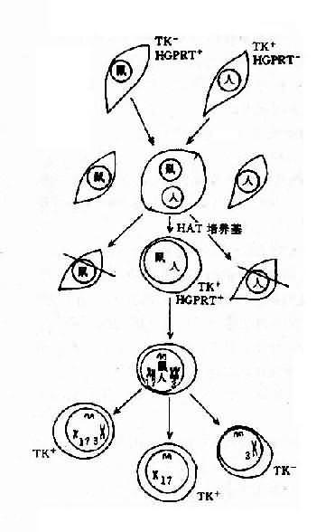1.体细胞杂交法 体细胞是生物体除生殖细胞外的所有细胞。将从身体分离的体细胞做组织培养进行遗传学研究的学科称为体细胞遗传学(somatic genetics)。体外培养细胞可人为控制或改变环境条件,并可建立细胞株,长期保存,进行各种正常和病理研究。与基因定位有关的是体细胞杂交(somatic cell hybridization)。细胞杂交又称细胞融合(cell fusion),是将来源不同的两种细胞融合成一个新细胞。大多数体细胞杂交是用人的细胞与小鼠、大鼠或仓鼠的体细胞(hybrid cell)进行杂交。这种新产生的融合细胞称为杂种细胞(hybrid cell),含有双亲不同的染色体。杂种细胞有一个重要的特点是在其繁殖传代过程中出现保留啮齿类一方染色体而人类染色体则逐渐丢失,最后只剩一条或几条,其原因至今不明。这种仅保留少数甚至一条人染色体的杂种细胞正是进行基因连锁分析和基因定位的有用材料。由于人和鼠类细胞都有各自不同的生化和免疫学特征,Miller等运用体细胞杂交并结合杂种细胞的特征,证明杂种细胞的存活需要胸苷激酶(TK)。但凡含有人第17号染色体的杂种细胞都因有TK活性而存活,反之则死亡。从而推断TK基因定位于第17号染色体上(图7-1)。这是首例用细胞杂交法进行的基因定位。由此可见,研究基因定位时,由于有杂种细胞这一工具,只需要集中精力于某一条染色体上,就可找到某一基因座位。