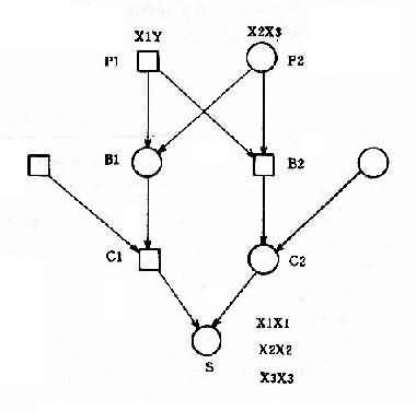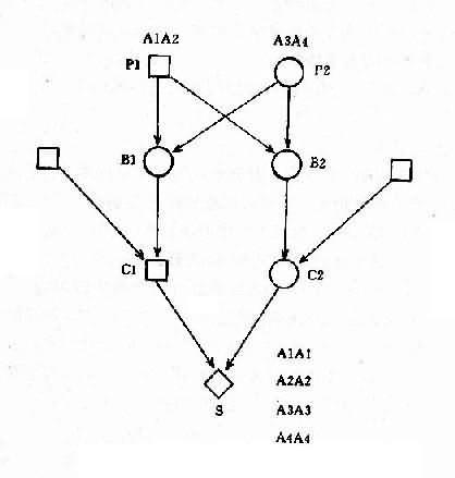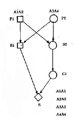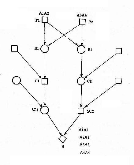 2)舅甥女(或姑侄)间的近交系数:如图6-2所示,P1的基因A1经B1传给S需要2步,这样S基因型A1A1共需5步,其概率为(1/2)5,其它基因型A2A2.A3A3和A4A4也是一样,因此,舅甥女之间的近交系数为4×(1/2)5=1/8。