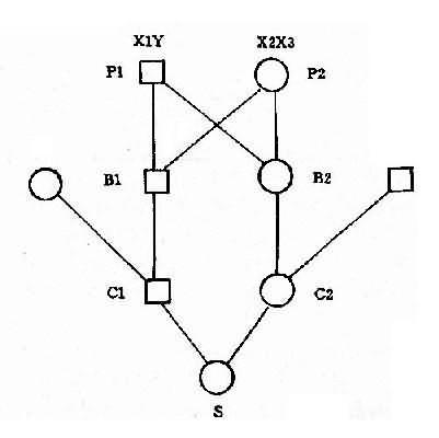 3)如表兄妹、堂表兄妹的近交系数:如图6-7和6-8所示,基因X1从P1→B1传递中断,基因X2、X3从P2经B1至C1传递中断,所以其近交系数F值为0。因此,从上图的X连锁基因传递来看,姨表兄妹,舅表兄妹的婚配要比姑表兄妹和堂兄妹的婚配危害要大。
