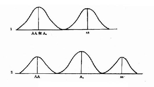 多基因遗传的数量性状(quantitative character)为连续变异的性状,可以正态分布曲线表示。人的身高、血压和智力都是多基因性状,而单基因的质量性状(qujalitatie character)则呈不连续变异。图5-1表示单基因的侏儒症身高的变异分布。该病患者的平均身高仅130cm。这类人的家系成员身高决定于基因型AA、Aa和aa,变异的分布呈不连续的特点,即变异个体可明显区分为几个群(即曲线的几个峰),这各人的身高表现为一种质量性状,群体间差异显著。而正常人的身高是基因性状,身高平均为165cm,变异在群体中是连续的,曲线只有一个峰即平均值。人身高由矮到高是逐渐过渡,很矮和很高的两种极端的人只是极少数,大多数人身高接近平均值,这种变异的曲线呈正态分布(图5-2)。