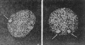 失活的X染色质在间期呈固缩状态,称为X染色质(X-chromatin)。在口腔颊粘膜细胞或其它细胞中都可以用简单的染色方法查见(图2-21)。X染色质的数目是X染色体数目减1。这样,当怀疑有X染色体异常时,可以通过用性染色质检查作出初步诊断。例如,X染色质在XO时为0,正常女性为1,XXY患者为1,XXX患者为2。