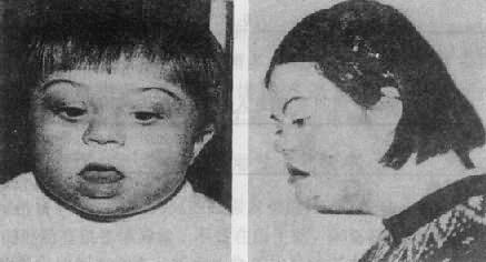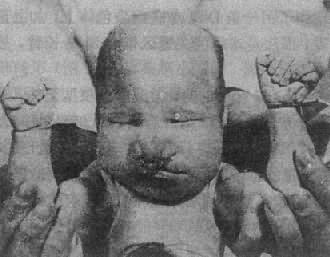 (2)临床表现:先天愚型患儿出生时体重和身长偏低,肌张力低下,突出的是颅面部畸形(图2-17),头颅小而圆,枕部扁平,脸圆而扁平,鼻扁平,脸裂细且上外倾斜,眼距过宽,内眦赘皮明显,常有斜视,虹膜时有白斑点,常见晶状体混浊,嘴小唇厚,舌大外伸(伸舌样痴呆之名由此而来),耳小,耳位低,耳廓畸形,颈背部短而宽,有多余的皮肤,由于软骨发育差,患者四肢较短,手宽而肥,通贯掌,指短,第5指常内弯,短小或缺小指中节,皮纹也有一定的特点(参阅第十章),腹肌张力低下而膨胀,故常有腹直肌分离或脐疝,约1/2以上的患者有先天性心脏病,主要是室间隔缺损、房室道连通、和运脉导管未闭,消化道的畸形如十二指肠的狭窄、巨结肠、直肠脱垂及肛门闭锁等也偶尔可见。在男性常有隐睾,睾丸有生精过程,但精子常减少,性欲下降,尚未见有生育者。女性患者通常无月经,但有少数能妊娠和生育。精神发育迟滞或智力低下(mental retardation,MR)是本病最突出最严重的表现,但其程度在各患者不完全相同,智商通常在25-50之间,高于50的很少。行为、动作倾向于定型化,抽象思维能力受损最大。