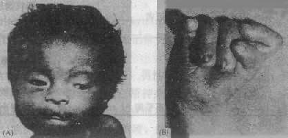 (1)临床表现:患儿出生时体重低,平均仅2243g,发育如早产儿,吸吮差,反应弱,头面部和手足有严重畸形(图2-19),头长而枕部凸出,面圆,眼距宽,有内赘眦皮,眼球小,角膜混浊,鼻梁细长,嘴小,耳位低,耳廓畸形(动物样耳),小颌(micrognathia),颈短,有多余的皮肤,全身骨骼肌发育异常,胸骨短,骨盆狭窄,脐疝或腹股沟疝,腹直肌分离等。手的畸形非常典型:紧握拳,拇指横盖于其它指上,其它手指互相叠盖,指甲发育不全,手指弓形纹过多,约1/3患者为通贯掌。下肢最突出的是“摇椅底足”,拇趾短,向背侧屈起。外生殖器畸形比较常见的有隐睾或大阴唇和阴蒂发育不良等。95%的病例有先天性心脏病,如室间隔缺损、动脉导管未闭等,这是死亡的重要原因。肾畸形,肾盂积水也很常见。患儿智力有明显缺陷,但因存活时间很短,多数难以测量。