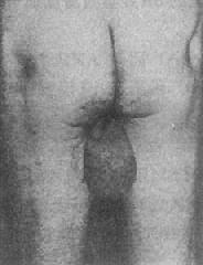 Klinefelter综合征的发病率相当高,男性新生儿中达到1.2‰。根据白种人的资料,身高180cm的男性患病率为1/260,在精神病患者或刑事收容机构中为1/100,在因不育而就诊者中约为1/20。临床表现为睾丸小而质硬,曲细精管萎缩,呈玻璃样变。由于无精子产生,故97%患者不育。患者男性第二性征发育差,有女性化表现,如无胡须,体毛少,阴毛分布如女性,阴茎龟头小等,约25%的患者有乳房发户(图2-22)。患者身材高。四肢长,一部分患者(约1/4)有智力低下,一些患者还有精神异常及患精神分裂症倾向。实验室检查可见雌激素增多,19-黄体酮增高,激素的失调与患者的女性化可能有关。