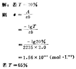 例如, 已知在525nm处KnO4溶液的ε=2235L· mol-1·cm-1,若用2cm比色皿,为使所测得的透光率介于20%~65%之间,溶液的浓度范围应是多少?