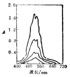 图8-3是几种不同浓度的KMnO4溶液的吸收曲线,溶液对波长525nm附近的绿光吸收量最强,而对其他波长的光吸收较弱。光吸收程度最大处的波长叫做吸收波长,用λmax表示。不同浓度的KMnO4溶液所得的吸收曲线,最大吸收波长都一致,只是相应的光被吸收的程度不同。