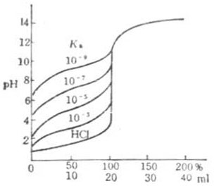 滴定的突跃范围不仅与酸碱浓度有关,还受到弱酸强度的影响。因此在进行此类滴定时必须考虑这两个因素。图7-3是用0.1000mol ·L-1NaOH溶液滴定20.00ml0.1000 mol ·L-1各种不同强度弱酸的滴定曲线.当弱酸的浓度一定时,Ka越大,滴定的突跃范围越大;Ka越小滴定的突跃范围就越小。当c(HB)=0.1000mol ·L-1时,Ka≤10-9,已无明显的滴定突跃,也无法用一般的指示剂确定反应终点。只有当c Ka≥10-8时方可用指示剂判别滴滴定突跃(约0.4个PH单位),所以常将c Ka≥10-8作为弱酸能被强碱准确滴定的先决条件。