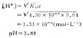 这时的溶液为H2CO3的饱和溶液,在通常的情况下为0.04mol·L-1,则第二化学计量点时溶液的[H+]为: