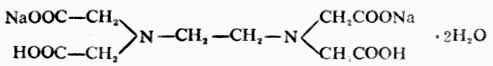 由于乙二胺四乙酸在水中的溶解度比较小,而其二钠盐在水中的溶解度却比较大。因些在实际应用中人们常采用EDTA二钠盐。EDTA二钠盐含有2分子结晶水,它的结构是:
