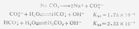 多元弱酸的强碱盐溶液PH值的计算,与一元强碱弱酸盐相类似。因 Kb1》Kb2 ,溶液中[OH-]主要由第一级碱式离解所产生,而第二级碱式离解产生的OH-及弱酸很少,可以忽略。计算时以Kb1代入式(2-4)中之Kb,即可算出[OH-]。例如Na2CO3溶液中