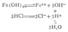 由于溶液中生成了弱电解质H2O,使[OH]-减小,溶液中[Fe3+][OH-]3<Fe(OH)3的Ksp,使平衡向Fe(OH)3溶解的方向移动,即向右移动.若有足量盐酸,沉淀可以完全溶解.