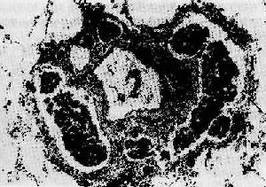 (2)血行播散:进入血管的癌细胞形成新的转移灶的可能性小于千分之一,因单个癌细胞进入血管后绝大多数为机体的免疫细胞消灭。但被血小板凝集成团的癌细胞形成的瘤栓则不易被消灭,并可与形成栓塞处的血管内皮细胞粘附,然后以前述机制穿过血管内皮和基底膜,形成新的转移灶(图7-8)。由于肿瘤的异质化而选择出的高侵袭性的瘤细胞亚克隆,尤其容易形成广泛的血行播散。