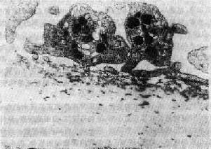 无论心或动脉、静脉内的血栓,其形成过程都从血小板粘附于内膜裸露的胶原开始。当内源性和外源性凝血途径启动后最后产生的凝血酶将纤维蛋白原水解,其纤维蛋白单体再聚合成纤维蛋白多聚体(纤维素)。纤维素和内皮下的纤维连接蛋白共同使粘集的血小板堆牢固地粘附于受损内膜表面,不再离散,形成境下均匀一致、无结构的血小板血栓,电子显微镜下,血小板彼此紧密接触,轮廓仍然保存,但内部颗粒已消失。在血小板与血小板之间有少量纤维素存在(图3-3)。