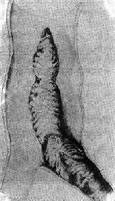 血栓形成于髂静脉内,向下腔静脉延续,当延续到对侧髂静脉入口处后,由于有血流流入,血小板继续析出,继续形成白色血栓,顺血流延伸,并常游离于血管腔内而不与血管壁粘连(采自Eder )