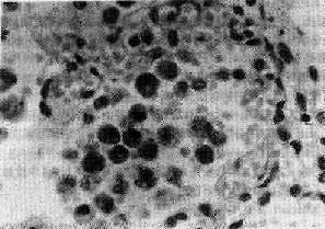 肺泡壁毛细血管充血,肺泡腔内漏出性出血并出现心力衰竭细胞×400