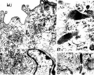 LU血管腔 ,P胞质突起, G高尔基复合体,V质膜小泡