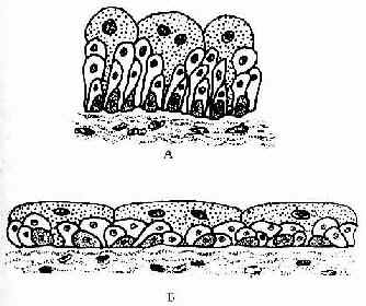 复层扁平上皮具有很强的机械性保护作用,分布于口腔,食管和阴道等的腔面和皮肤表面,具有耐磨擦和阻止异物侵入等作用。受损伤后,上皮有很强的修复能力。位于皮肤表面的复层扁平上皮,浅层细胞已无胞核,胞质中充满角蛋白(一种硬蛋白),已是干硬的死细胞,具有更强的保护作用,这种上皮称角化的复层扁平上皮(keratinized stratified squamous epithelium)(见皮肤章)。衬贴在口腔和食管等腔面的复层扁上皮,浅层细胞是有核的活细胞,含角蛋白少,称未角化的复层扁平上皮(nonkeratinized stratified squamous epithelium)。