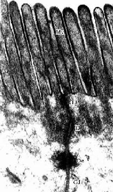 电镜下可见微绒毛表面为细胞膜,内为细胞质。微绒毛直径约0.1μm,长度因细胞种类或细胞生理状态的不同而有很大差别。绒毛轴心的胞质中有许多纵行的微丝(microfilament)。微丝一端附着于微绒毛尖端;另一端下伸到细胞顶部,附着于此部胞质中的终未网(terminal web)(图2-8,2-9)。终末网在吸收功能旺盛的上皮细胞中明显,为顶部胞质中的细丝(filametn)交织成的密网,网与细胞游离面平行,组成网的细丝固着于细胞侧面的中间连接(图2-8,2-9)。微绒毛中的微丝为肌动蛋白丝,终末网中有肌球蛋白。微绒毛大概也以肌丝滑动的方式伸长或缩短。微绒毛显著地扩大了细胞的表面积,参与细胞吸收物质的作用。