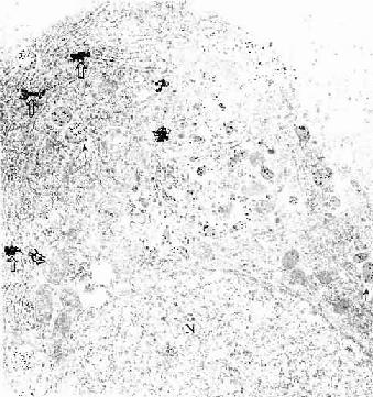 图1-7 免疫细胞化学(蛋白A-胶体金法)和原位杂交术示大鼠垂体