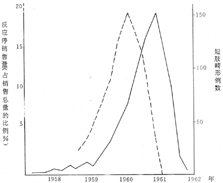 如反应停(商品名Grippex)有安眠和镇静作用,常为孕妇所使用。在联邦德国,从1959年开始在市场销售,1960年销售量迅速上升。1960年底和1961年初出生短肢畸形病例数亦随之上升。两条曲线相隔3个季度,故反应停销售量曲线正与这些病例的母亲怀孕初期相吻合。1961年12月对反应停进行干预,从联邦德国市场撤消,反应停停止出售后,1962年下半年以后出生的儿童便很少发生这种畸形。说明此不良反应是反应停所致。见图6-6。