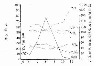 图2-6 阴囊皮炎逐月发病与各种水溶性维生素供给量的关系