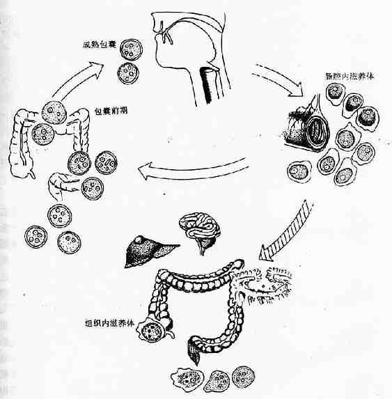 在肠腔内增殖的滋养体可随肠内容物下移,随着肠内环境的变化,如水分逐渐被吸收等,停止活动,团缩,排出未消化食物,形成囊前期,此期胞质内有时可出现一种特殊的营养储存结构 ──拟染色体(chromatoid body),经分析系由90%以上的核糖核蛋白体聚合而成,能被深染,呈现独特的短棒状,为虫种鉴别的形态学特点。囊前期形成后,胞质分泌囊壁包裹于质膜之外,形成圆形的包囊期。包囊直径在10~20µm之间,电镜下可见囊壁为双层。包囊初期只具一个胞核,随后二次分裂为4核,偶见8核,粪便中可查到成熟度不同的1核、2核或成熟的4核包囊,核的结构同滋养体期,在1或2核包囊可见糖原泡和棍状的拟染色体。碘染时包囊呈淡棕色或黄色,糖原泡为棕红色(彩图Ⅲ)铁苏木素染色的包囊为深蓝色,糖原泡被溶解成空泡,拟染色体色深更清晰。包囊为阿米巴的传播阶段,仅见于宿主的粪便内,4核包囊具感染性,在传播上起重要作用,为阿米巴的传播阶段,仅见于宿主的粪便内,4核包囊具感染性,在传播上起重要要作用,入侵组织的滋养体不形成包囊,复合体内侵袭与非侵袭种的包囊则无法从形态学上加以肠下段经硷性消化液作用后,囊壁变薄,虫体活跃,随即脱囊而出形成含4个胞核的囊后滋养体。此期历时甚短,脱囊后核很快各分裂一次,继之胞体分为8个个体较小的小滋养体,在回盲部定居于结肠粘膜皱褶或肠腺窝间,以宿主肠粘液、细菌及已消化食物为营养,发育至一定大小后不断以二分裂增殖。在肠腔内的滋养体称小滋养体,虫体较小(10~20µm)也称肠腔共栖型。小滋养体在某种因素影响下可不同程度地入侵肠壁,可吞噬红细胞和组织细胞转变为大滋养体,也称组织型滋养体,其体积较大(20~40µm),运动活泼,并不断破坏肠壁组织,引起原发病灶;侵入肠组织的滋养体可随血流至肝或其他部位;也可能随坏死组织脱落入肠腔,在急性期肠蠕动增加的情况下,大滋养体无成囊的充分时间,致使大量排出体外。(图10-2)。由于滋养体对外环境的抵御力很弱,故在传播上不起作用。而在无症状带虫者的正常粪便中可排出大量包囊,成为流行病学上的重要传染源。据估计一个带虫者每天排出的包囊可逾5000多个。