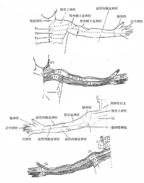 图5-34上肢皮神经分布区及皮肤的节段性神经分布