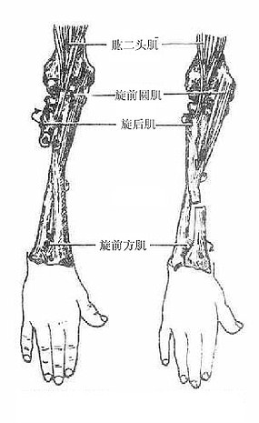 桡尺近侧和远侧关节是联合关节,属于车轴关节的类型,可使前臂作旋转运动,旋前的肌肉有旋前圆肌和旋前方肌,旋后的肌肉和旋后肌、肱二头肌和肱桡肌。当上臂固定时,旋转运动的范围为180°,连同肩关节的旋转,上肢旋转范围可达300°以上。