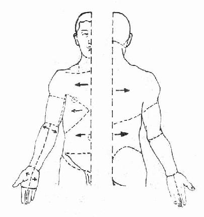 (1)从胸骨颈静脉切迹,沿胸部正中线至剑突根部。(2)由剑突根部,沿肋弓向外下方至腋中线。(3)自颈静脉切迹,向外沿锁骨上缘至肩峰。(4)从剑突根部,向上外斜行至乳头(男性尸体绕乳晕周围作一圆形切口,女性尸体则沿乳房周围切开皮肤),继向上外至腋前襞,再转至臂内侧纵行向下达臂上1/3与中1/3交界处作一横切口。