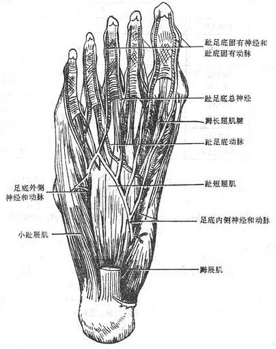 3.足底内侧神经 medialplantar nerve 与同名动脉伴行,肌支支配拇屈肌、拇短展肌、趾短屈肌及第1、2蚓状肌;皮支支配足底内侧半和拇趾至第4趾的相对缘及第4趾的内侧面的皮肤。