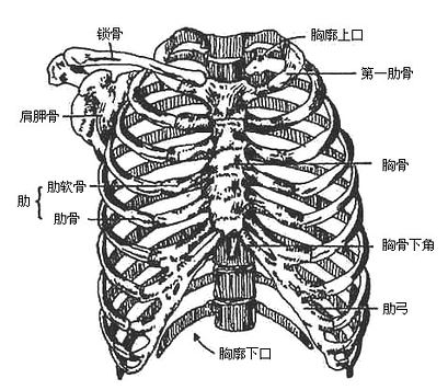胸廓thoracic cage是胸腔壁的骨性基础和支架。胸廓由12个胸椎,12对肋骨rids,和1个胸骨sternum借关节、软骨连结而组成。