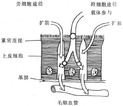 营养物质和水可以两条途径进入血液或淋巴:一为跨细胞途径,即通过绒毛柱状上皮细胞的腔面膜进入细胞,再通过细胞底-侧面膜进入血液或淋巴;另一为旁细胞途径,即物质或水通过细胞间的紧密连接,进入细胞间隙,然后再转入血液或淋巴(图6-26)。营养物质通过膜的机制包括扩散、易化扩散、主动转运及胞饮等,其过程可参看第二章第一节。