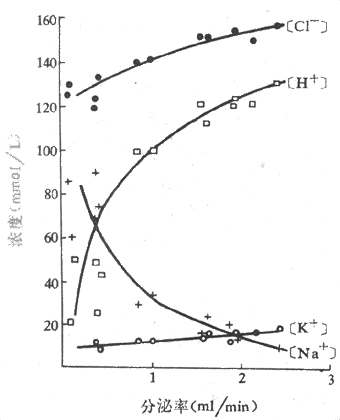 图6-10 人胃液中电解质浓度与分泌率的关系胃液分泌是用组胺静脉注射引起的